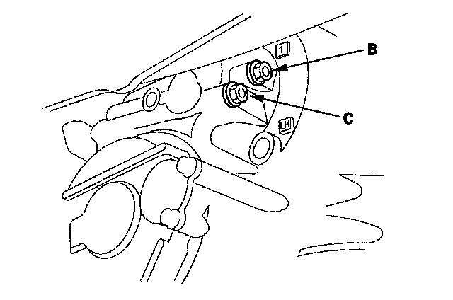 15. Shift to 1st gear, and measure the 1st clutch pressure at the 1st clutch pressure inspection port (B) and the 1st-hold clutch pressure at the 1st-hold clutch pressure inspection port (C) while holding the engine speed at 2,000 rpm.