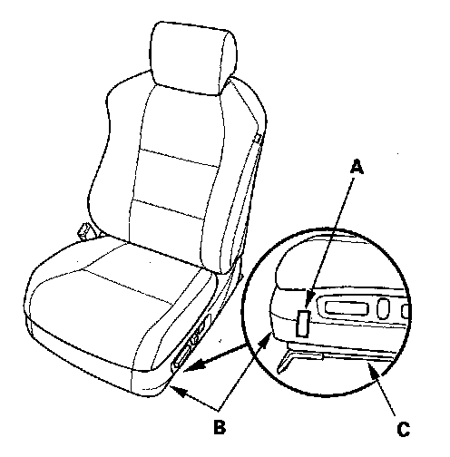 7. Using a piece of tape (A), mark the location on the seat's outer cover (B) where the front riser cover meets the seat riser (C). The driver's seat position sensor should read "NEAR."