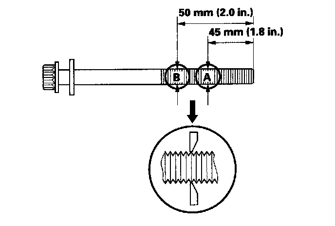 If either diameter is less than 11.3 mm (0.44 in.), replace the cylinder head bolt.