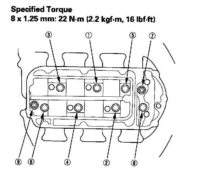 Cylinder HeadTorque the cylinder head bolts in sequence to 30 N-m (3.0 kgf-m, 22 lbf-ft). After torquing, tighten all cylinder head bolts in two steps (90° per step) if you are using a new cylinder head bolt, tighten the bolt an extra 90°.