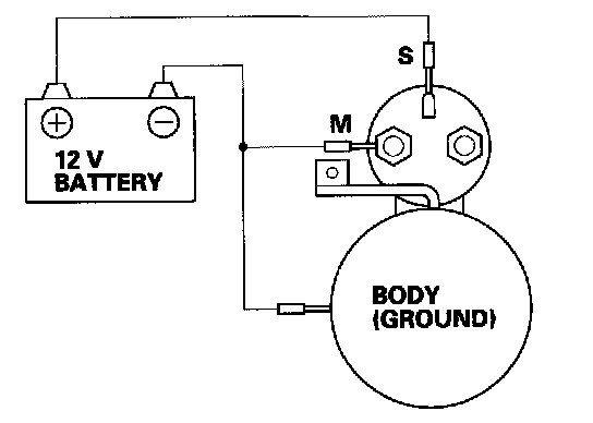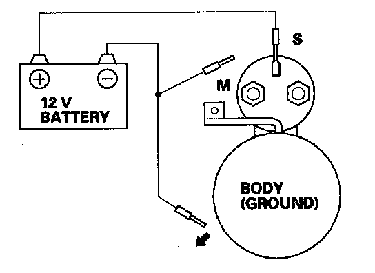 3. Connect the battery as shown. Make sure you disconnect the starter motor wire from the solenoid. If the starter pinion moves out, it is working properly.