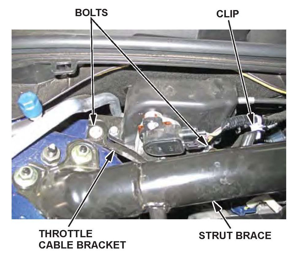 6. Remove the two bolts from the throttle cable bracket, then detach the clip from the strut brace.