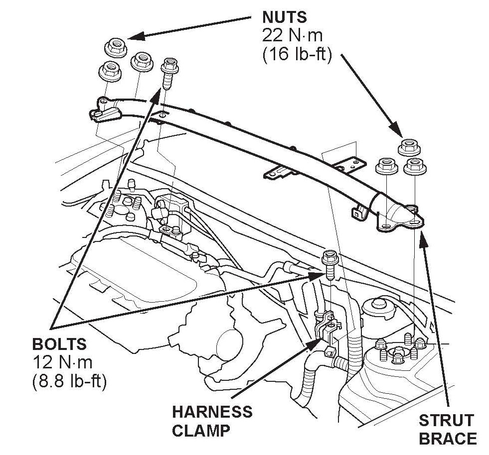51. Reinstall the strut brace. Torque the nuts to 22 N.m (16 lb-ft) and the bolts to 12 N.m (8.8 lb-ft).