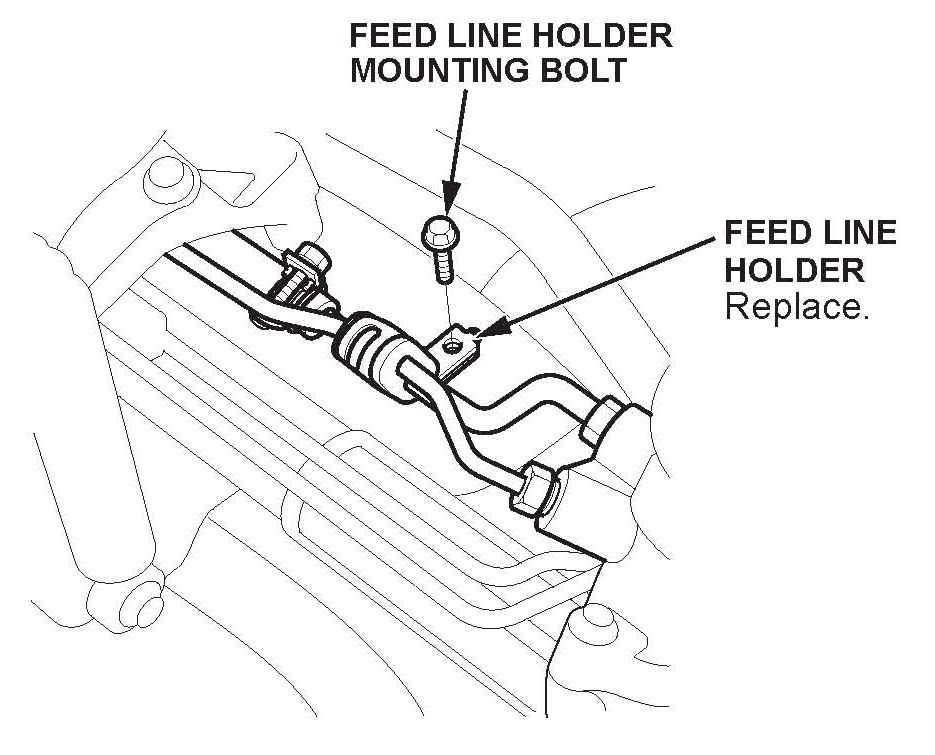 9. Remove the feed line holder mounting bolt from the front suspension subframe that is located on the driver's side. Remove the holder from both the feed and return lines because it will not be reused.