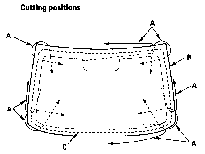 7. With a helper on the outside, pull the piano wire (A) back and forth in a sawing motion. Hold the piano wire as close to the rear window (B) as possible to prevent damage to the body, and carefully cut through the adhesive (C) around the entire rear window.