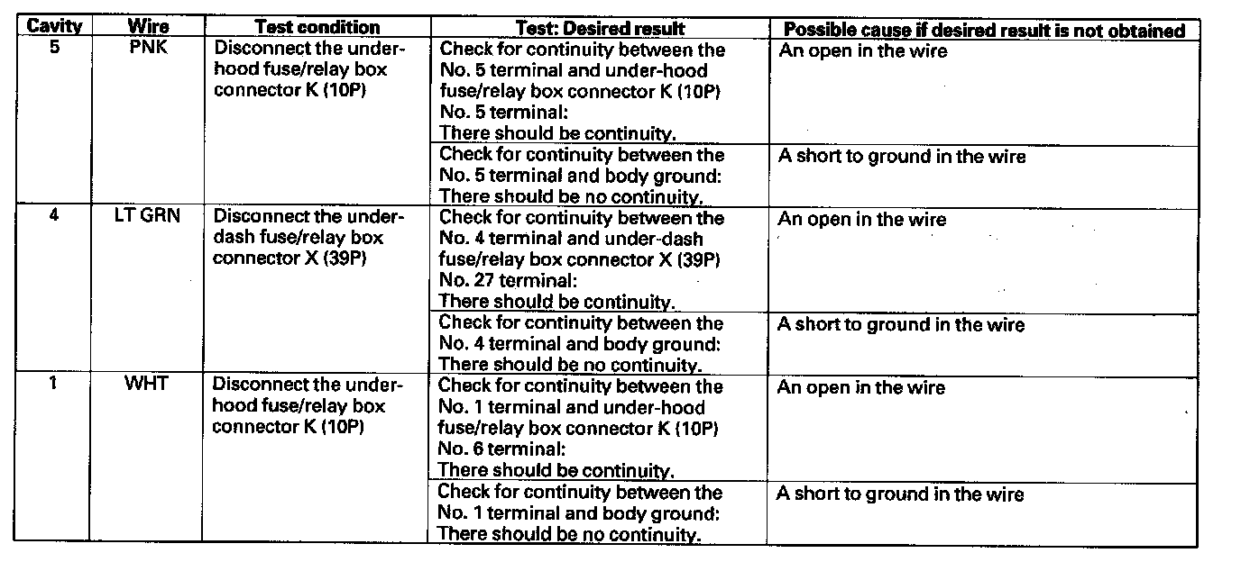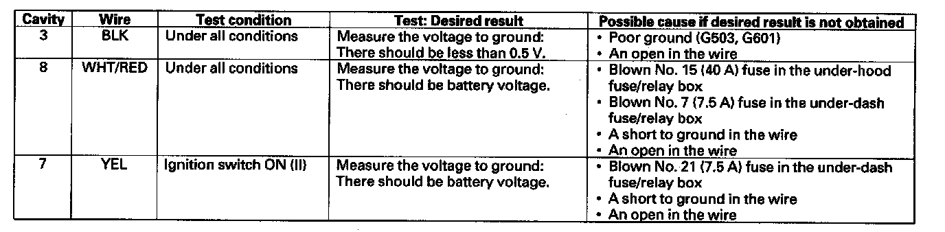 7. Disconnect the connector from the wiper/washer switch, and make these input tests at the connector.