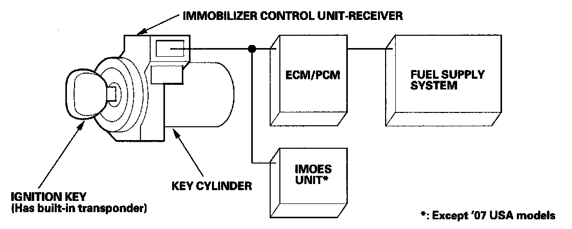This system consists of a transponder located in the ignition key, an immobilizer control unit-receiver, an indicator, imoes unit (Except '07 USA models), and the ECM/PCM.
