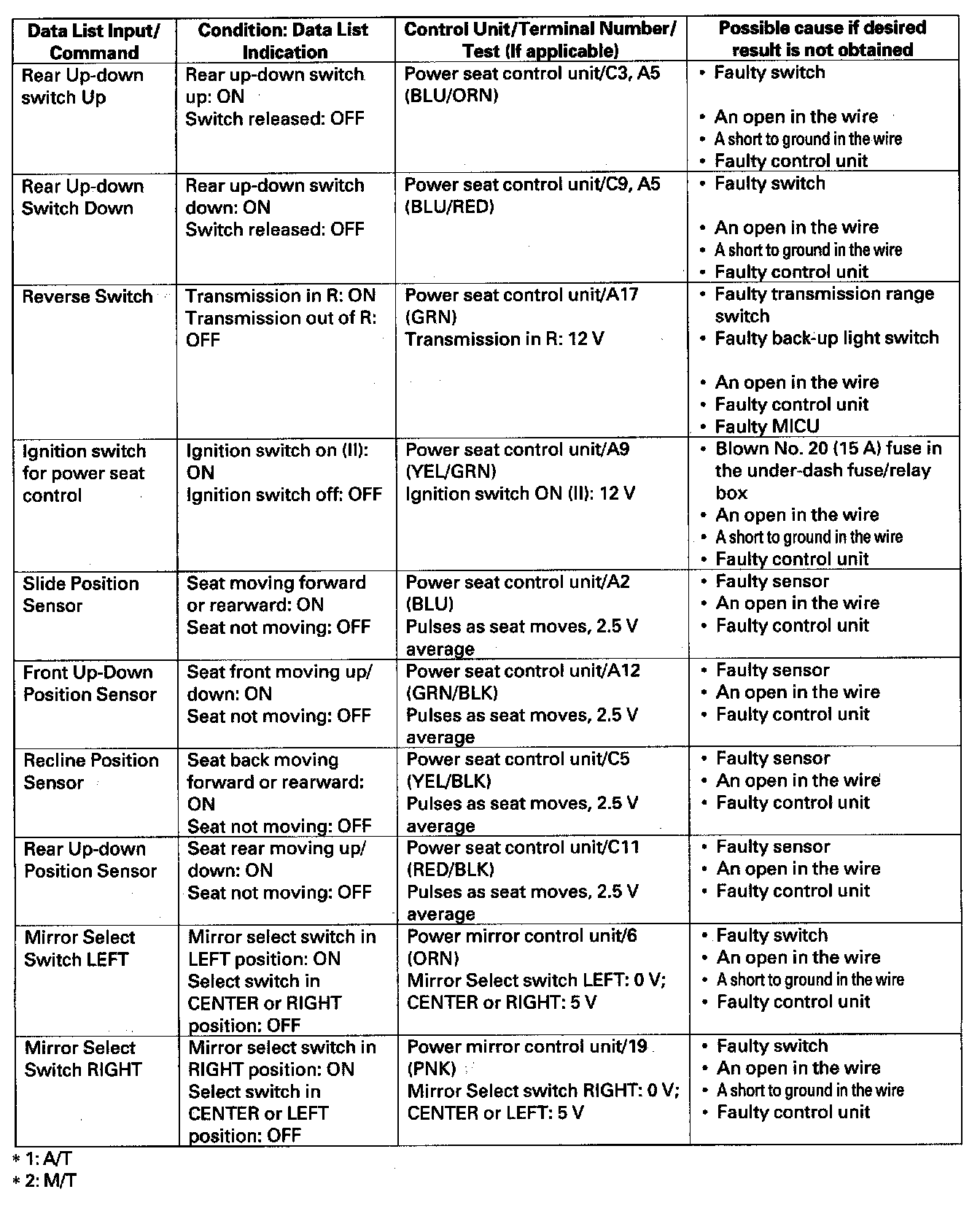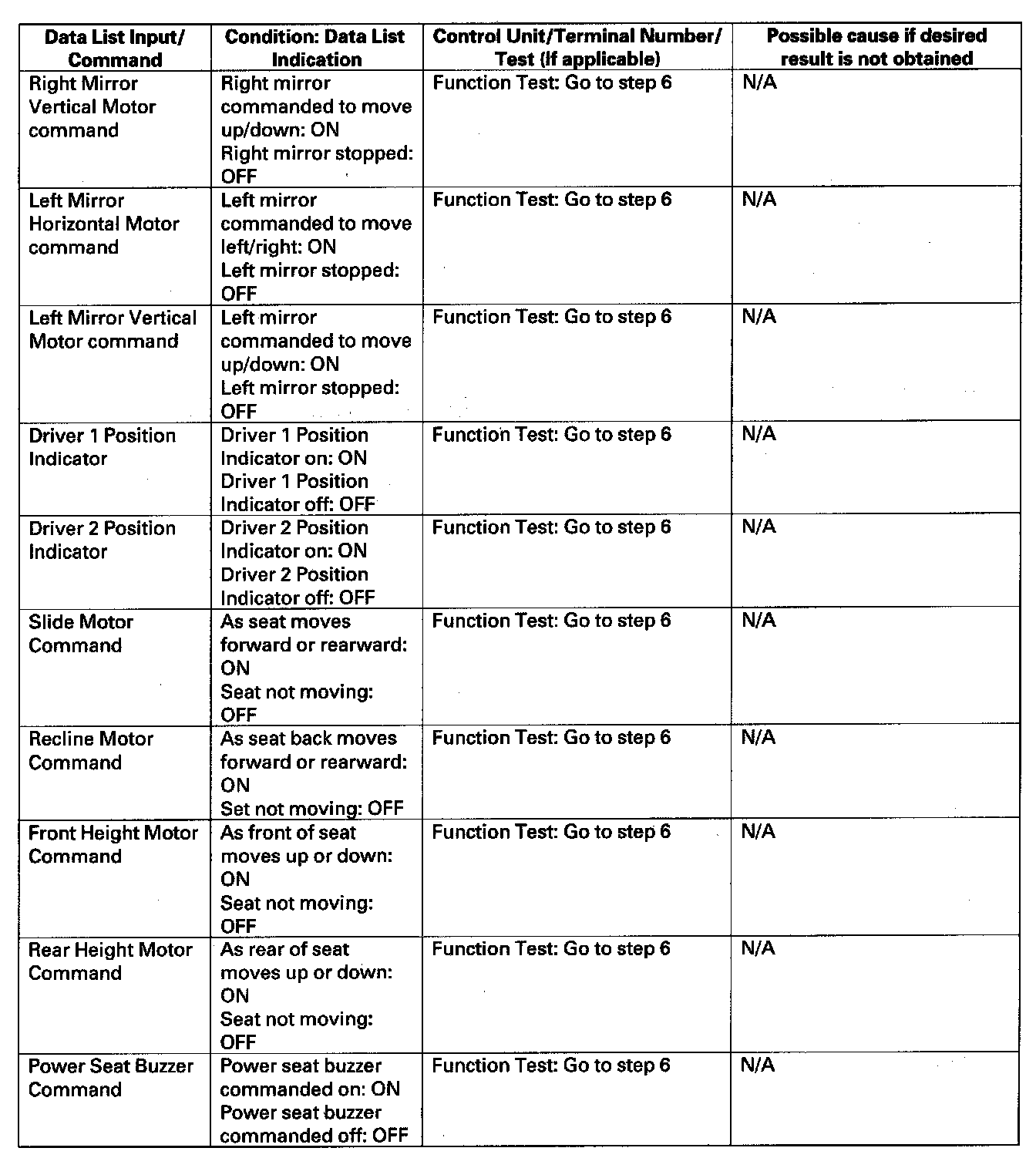 4. Exit the DTC mode and select Data List from the Power Seat/Power Mirror Test Mode Menu.