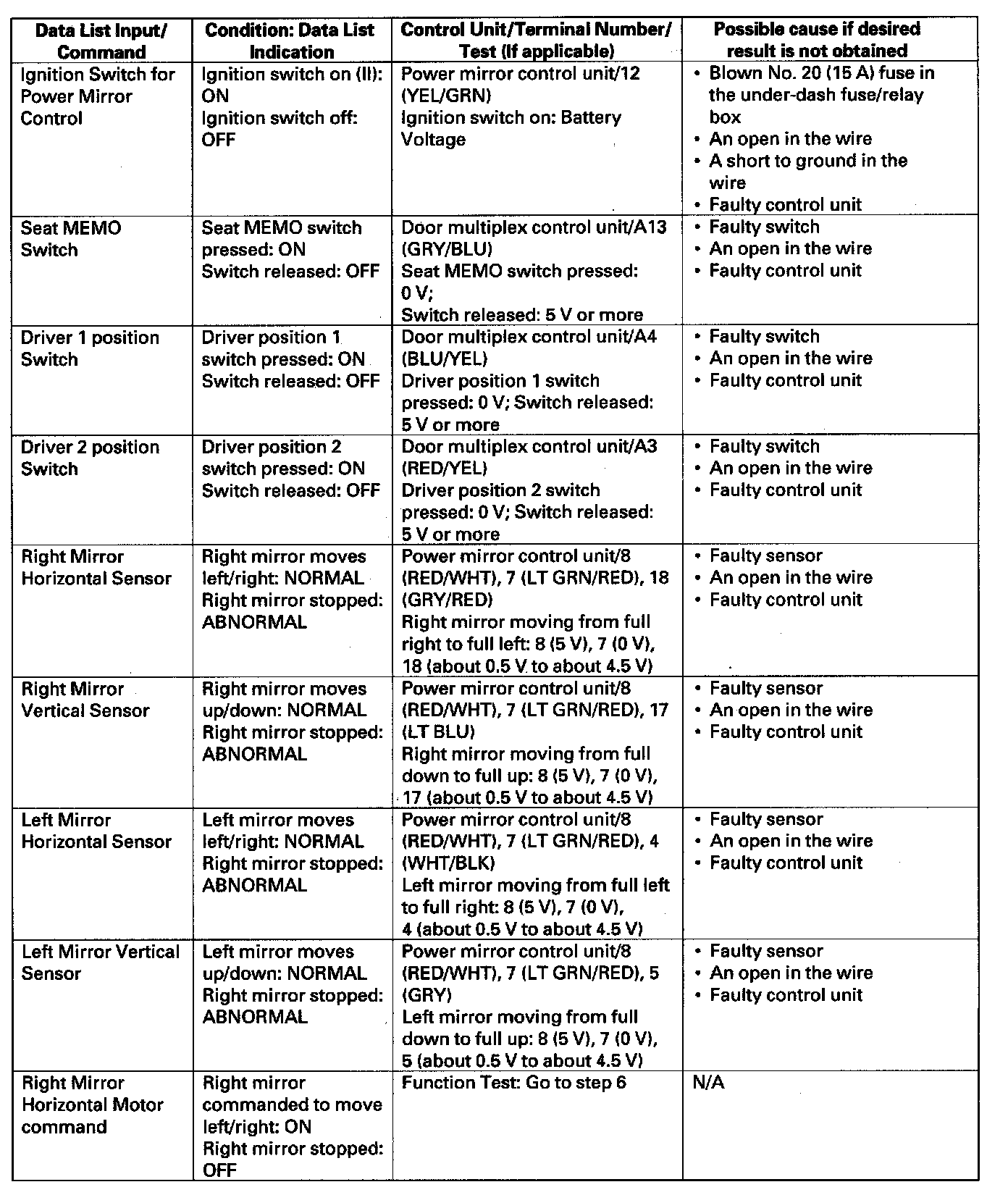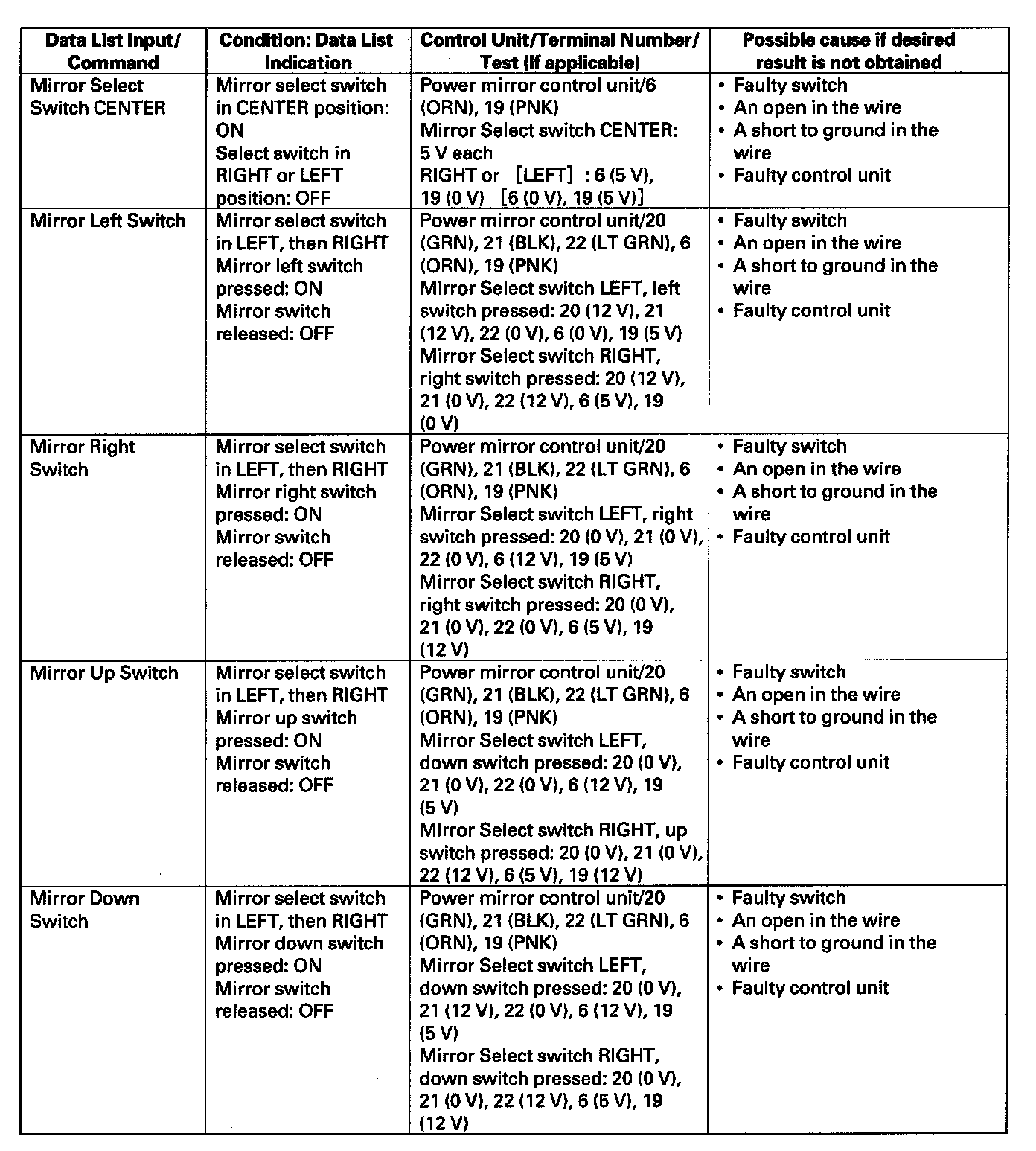 - If the data list indication is not correct, perform the appropriate test at the control unit and terminal indicated in the table.