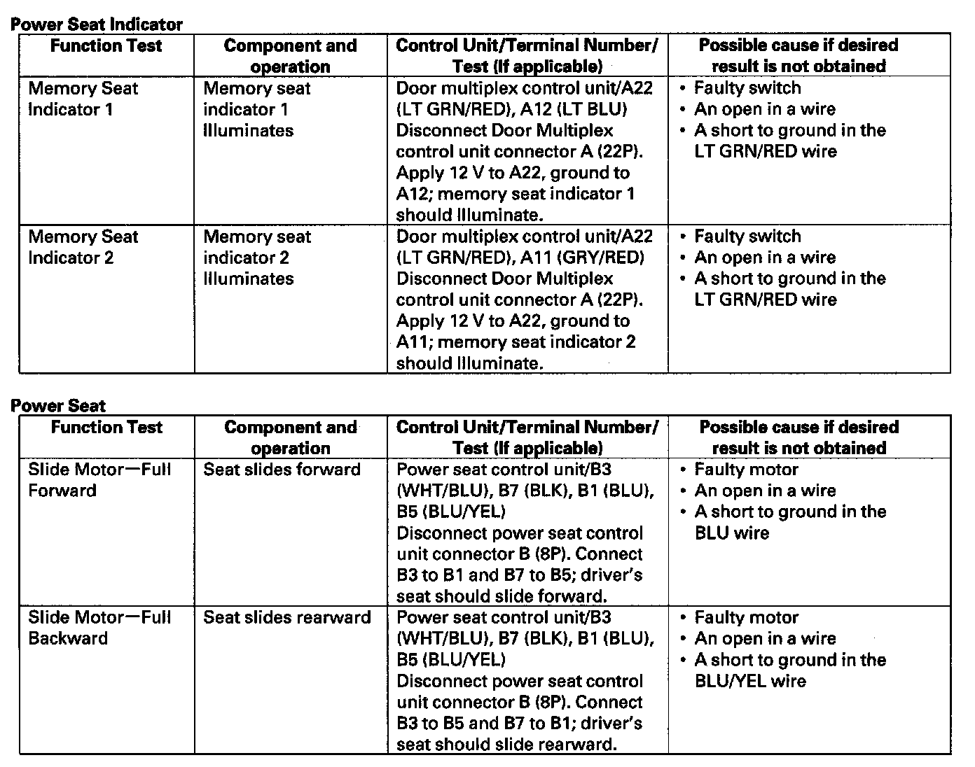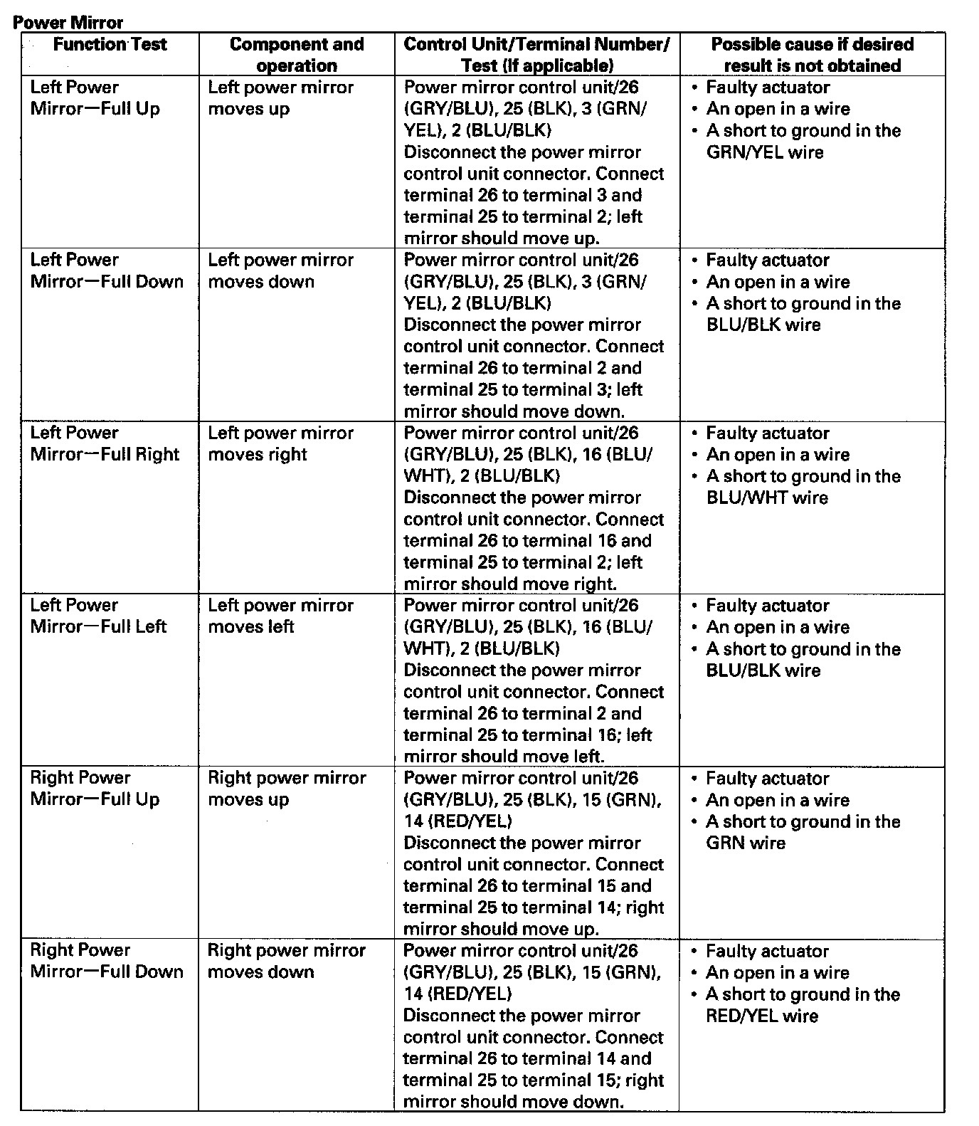 - If the function does not occur, perform the appropriate test at the control unit and terminal indicated in the table.