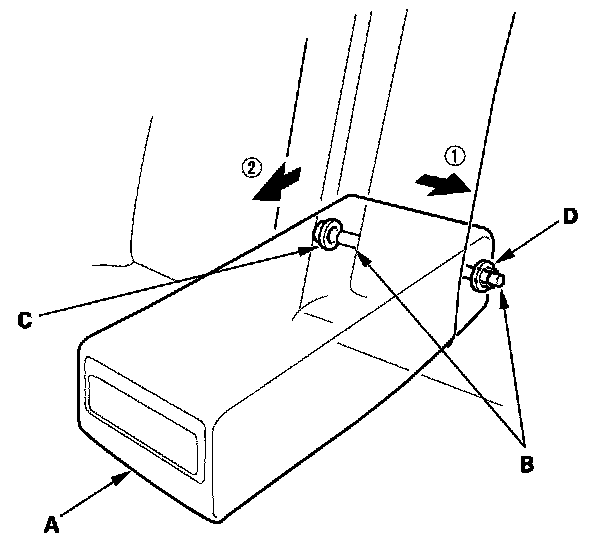 2. Remove the pivot shaft (B) from the collar (C) on the passenger's side of the vehicle by pulling forward on the armrest, and remove the pivot shaft from the collar (D) by pulling up on the armrest.