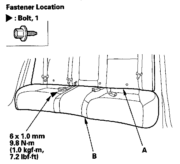 1. Remove the bolt from between the seat-back (A) and the seat cushion (B).