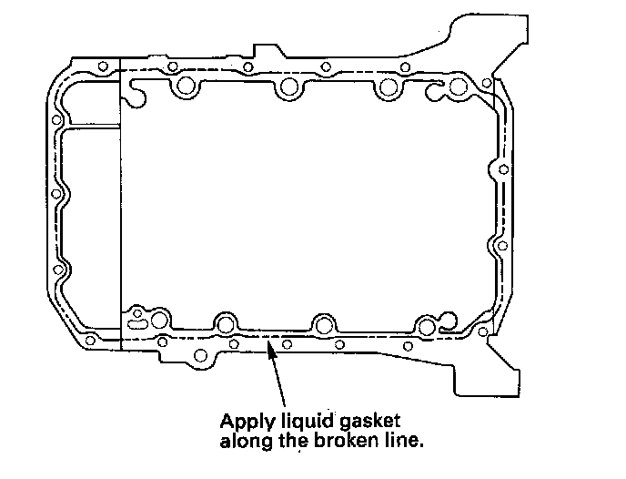 3. Apply liquid gasket, P/N 08717-0004, 08718-0001, 087180003, or 08718-0009, evenly to the oil pan mating surface of the engine block. Install the component within 5 minutes of applying the liquid gasket.