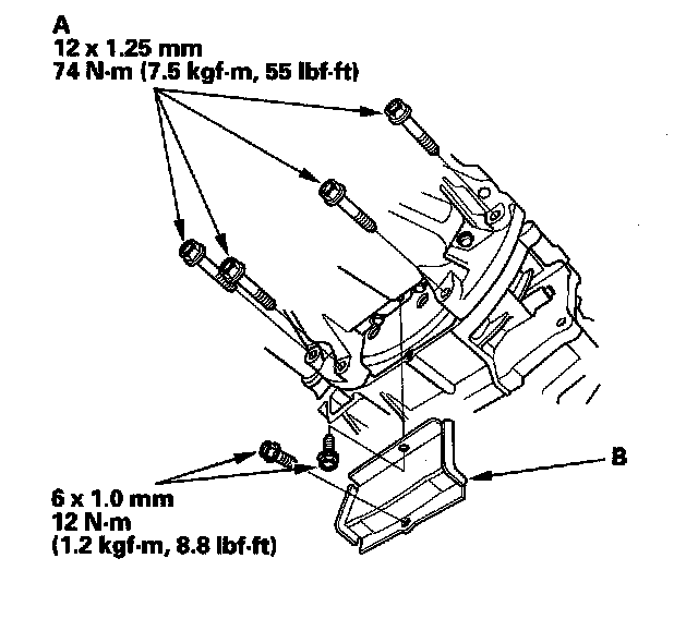 6. Tighten the four bolts (A) securing the transmission, then install the torque converter cover (A/T) or clutch cover (M/T) (B).