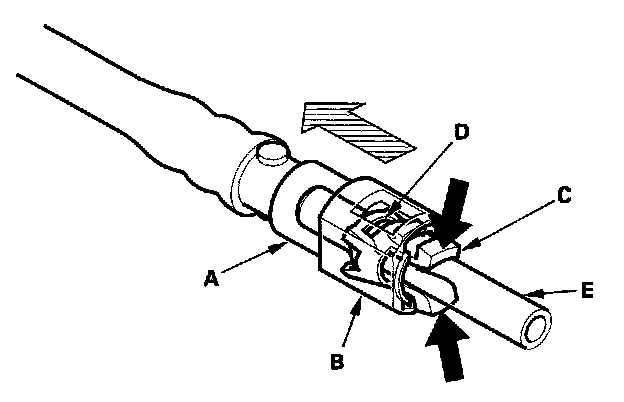 16. Disconnect the quick-connect fitting (A): Hold the connector (B) with one hand, and squeeze the retainer tabs (C) with the other hand to release them from the locking tabs (D). Pull the connector off.
