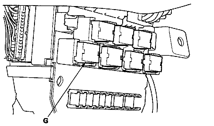 2. Remove the left kick panel, then remove PGM-FI main relay 2 (G) from the under-dash fuse/relay box.