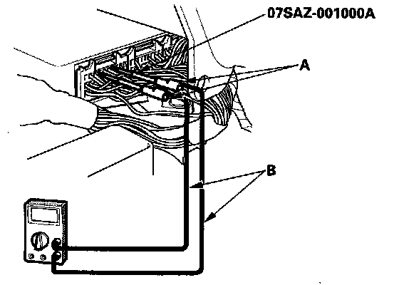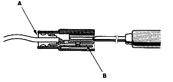 3. If you cannot get to the wire side of the connector or the wire side is sealed (A), disconnect the connector, and probe the terminals (B) from the terminal side. Do not force the probe into the connector.