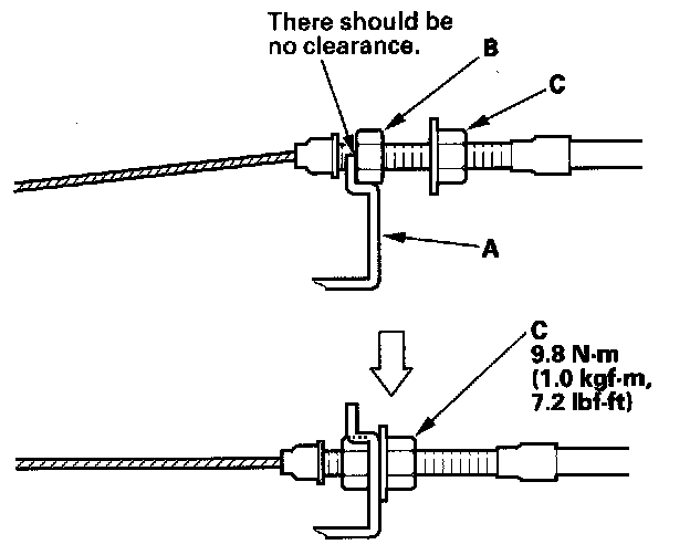 7. Set the cable on the bracket (A). Adjust the adjusting nut (B) so that its free play is 0 mm.