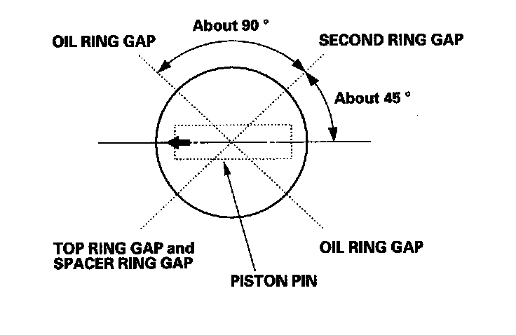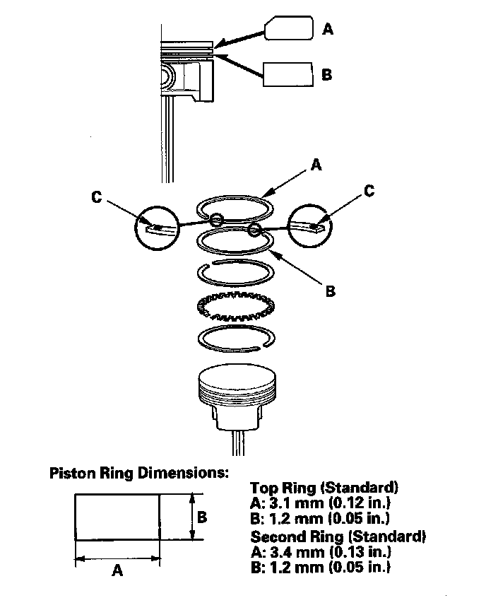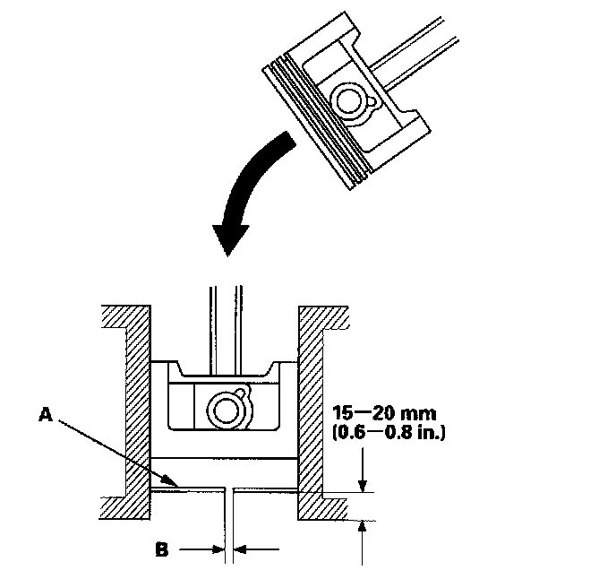 Using a piston, push a new ring (A) into the cylinder bore 15 - 20 mm (0.6 - 0.8 in.) from the bottom.