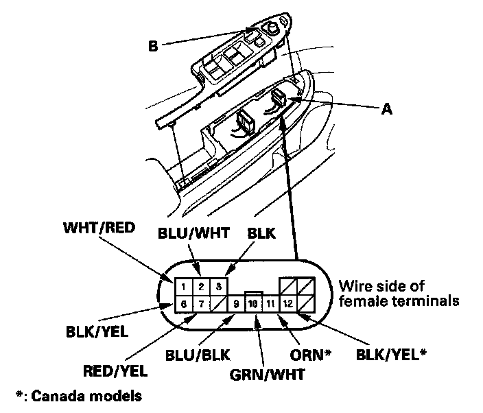 2. Disconnect the 13P connector (A) from the power mirror switch (B), and inspect the terminals. If OK, go to step 3.