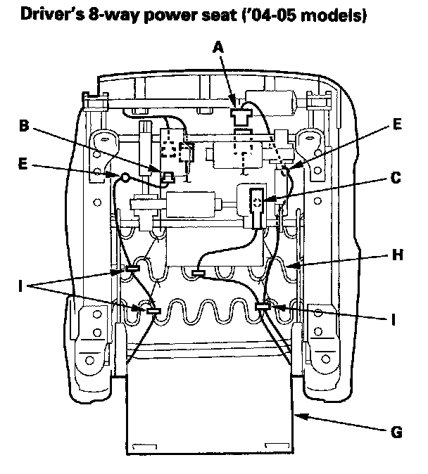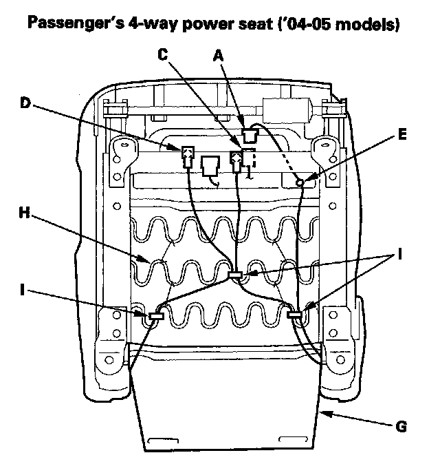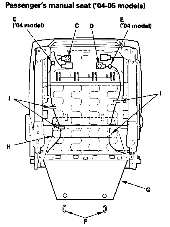 3. '04-05 models: From under the seat cushion, disconnect the recline motor connector (A), and the seat-back heater connector (B) on the driver's 8-way power seat. Detach the side airbag connector clip (C), OPDS unit connector clip (D) on the passenger's 4-way power seat and passenger's manual seat, and harness clips (E). Release the clips (F) (passenger's manual seat) and seat cushion cover (G) from the seat cushion frame spring (H), then pull the cover back, and remove the clamps (I).