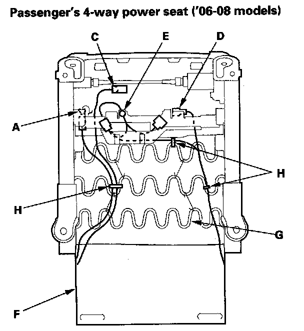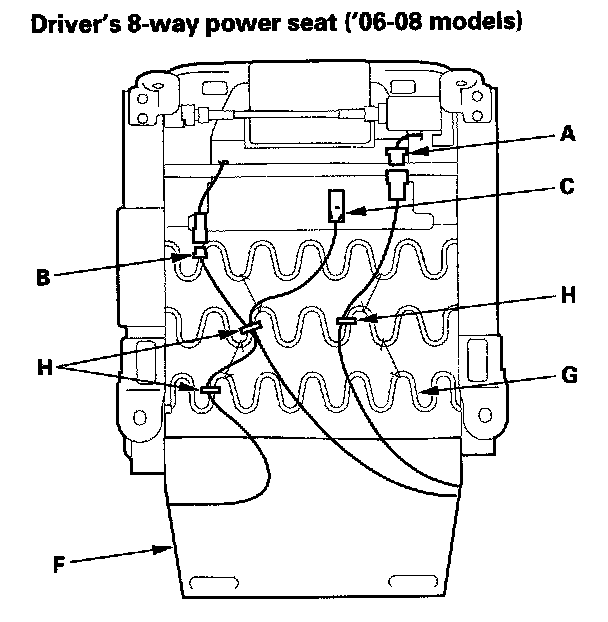4. '06-08 models: From under the seat cushion, disconnect the recline motor connector (A), and the seat-back heater connector (B) on the driver's 8-way power seat. Detach the side airbag connector clip (C), ODS unit connector clip (D) and harness clip (E) on the passenger's 4-way power seat. Release the seat cushion cover (F) from the seat cushion frame spring (G), then pull the cover back, and remove the clamps (H).