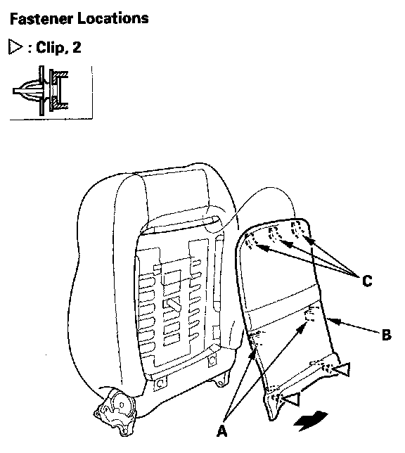 7. Detach the clips and hooks (A) by pulling the bottom of the back panel (B) back, then pull the panel downward to release the hooks (C) from the seat-back frame, and remove the panel. Driver's 8-way power seat and passenger's 4-way power seat are shown; passenger's manual seat is similar.