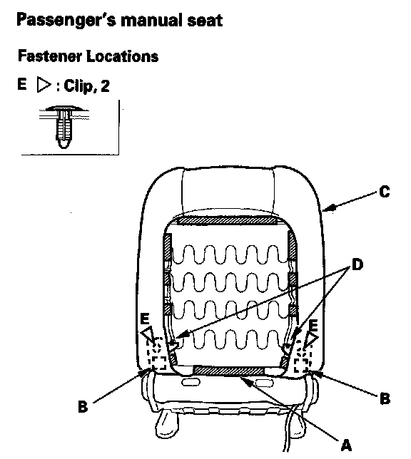 8. Release the hook strips (A), and fasteners (B) on the passenger's manual seat, then loosen the seat-back cover (C). Release the clips (D) and/or detach the clips (E).