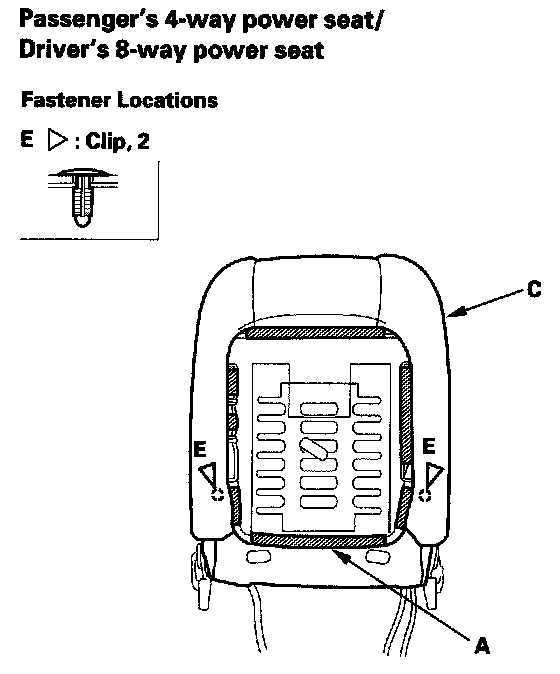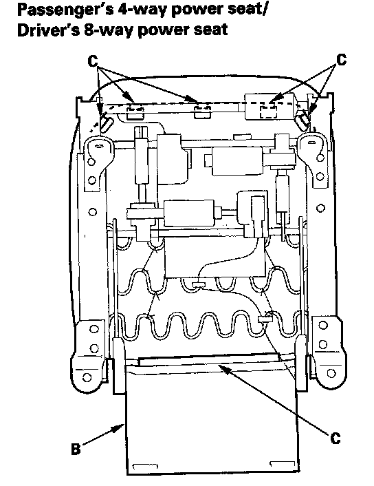 NOTE: Driver's 8-way power seat is shown; passenger's 4-way power seat is similar; passenger's manual seat is similar, but its seat-back remains on.