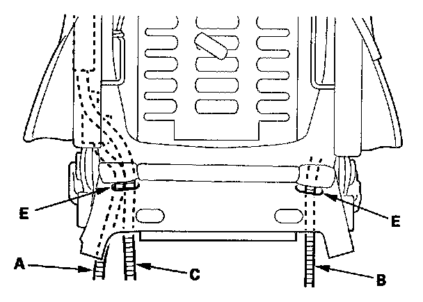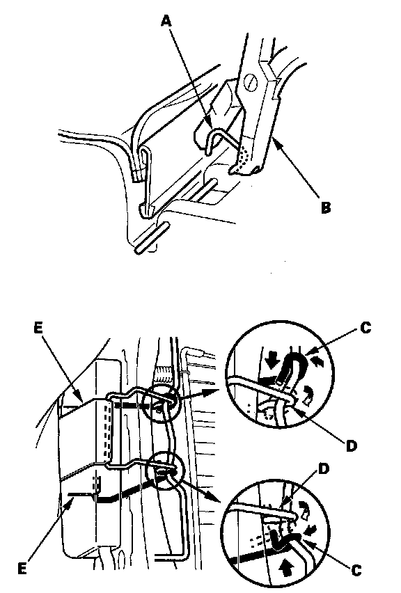 - Reinstall the front hook (C) and rear hook (D) of the reinforcing cloth (E) securely.
