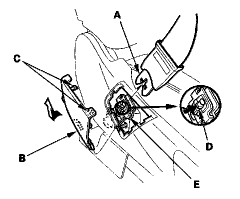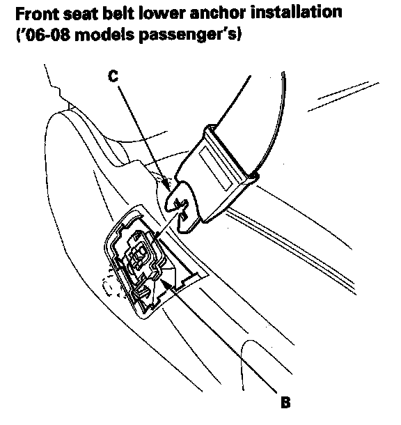 - '06-08 models passenger's: Before attaching the front seat belt lower anchor (B), make sure there are no twists or kinks in the belts. Insert the latch plate (C) into the lower anchor, and be sure the lower anchor is locked securely.