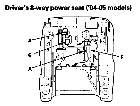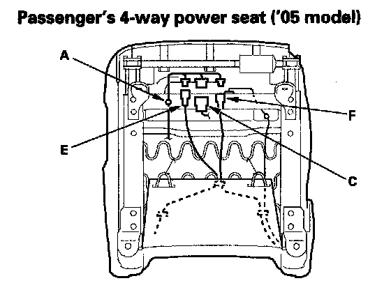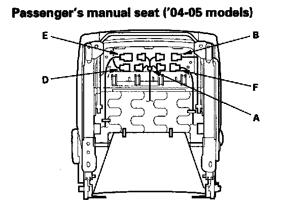 9. '04-05 models: Lift up the front seat, then detach the harness clip (A), and disconnect the seat belt switch connector (B) on the passenger's manual seat, the power seat harness connector (C) on the driver's 8-way power and passenger's 4-way power seat, the seat heater connector (D) on the passenger's manual seat, the side airbag connector (E) on each type seat, and the OPDS unit connector (F) on the passenger's 4-way power and passenger's manual seat.