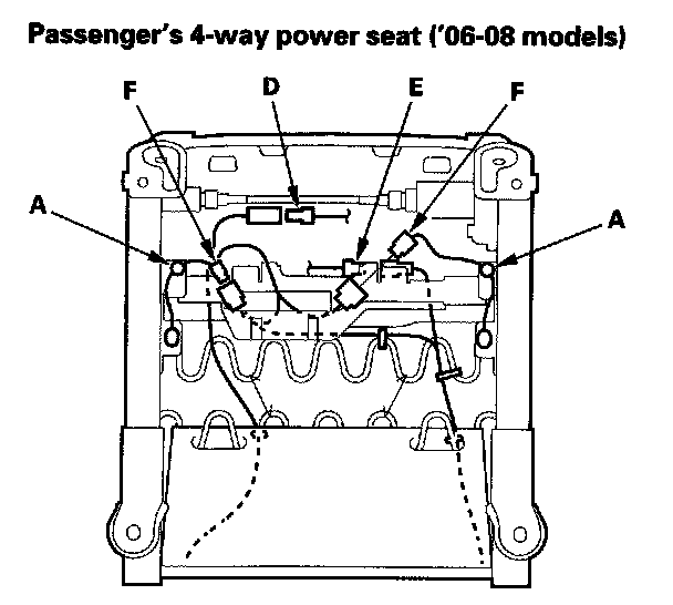 10. '06-08 models: Lift up the front seat, then detach the harness clips (A), and disconnect the power seat harness connector (B), the seat position sensor connector (C) on the driver's 8-way power seat, the side airbag connector (D), ODS unit connector (E), and seat weight sensor connectors (F) on the passenger's 4-way power seat.