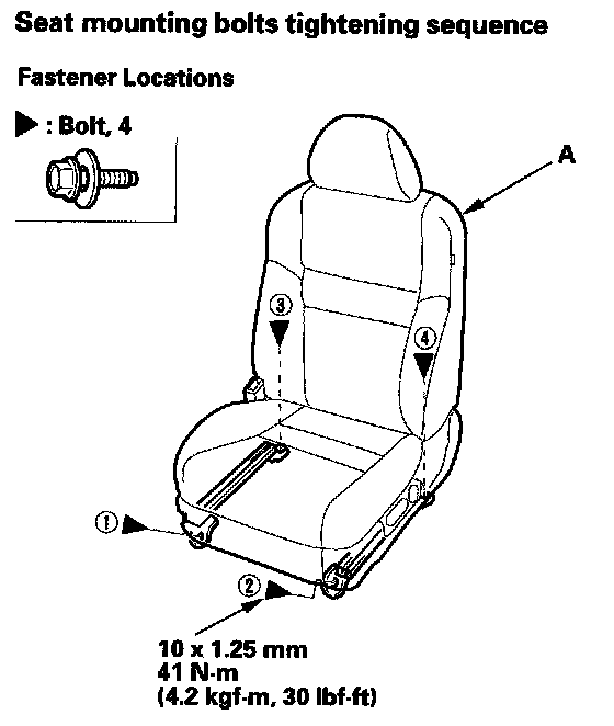 - Tighten the seat mounting bolts to the specified torque in the sequence shown. Slide the seat (A) all the way back and tighten (1) and (2), then slide it forward and tighten (3) and (4). The driver's seat is shown, the passenger's seat is similar.