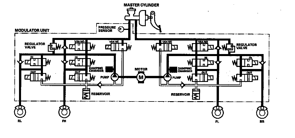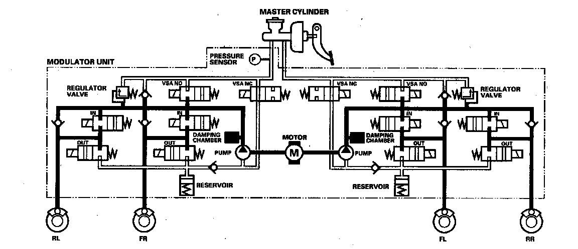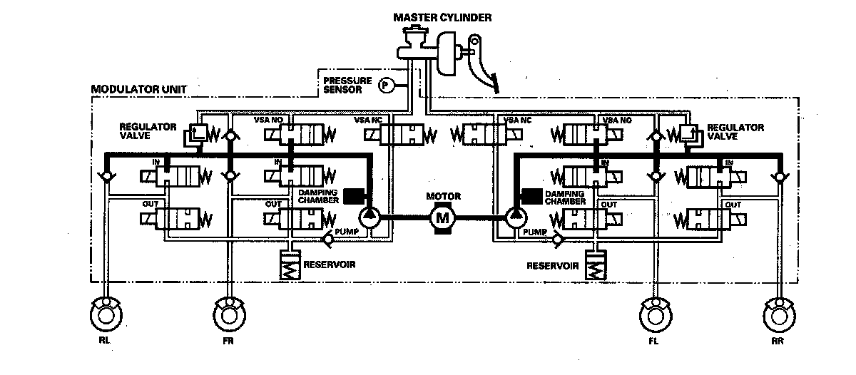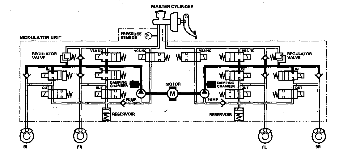 The hydraulic circuit is an independent four channel type, one channel for each wheel.