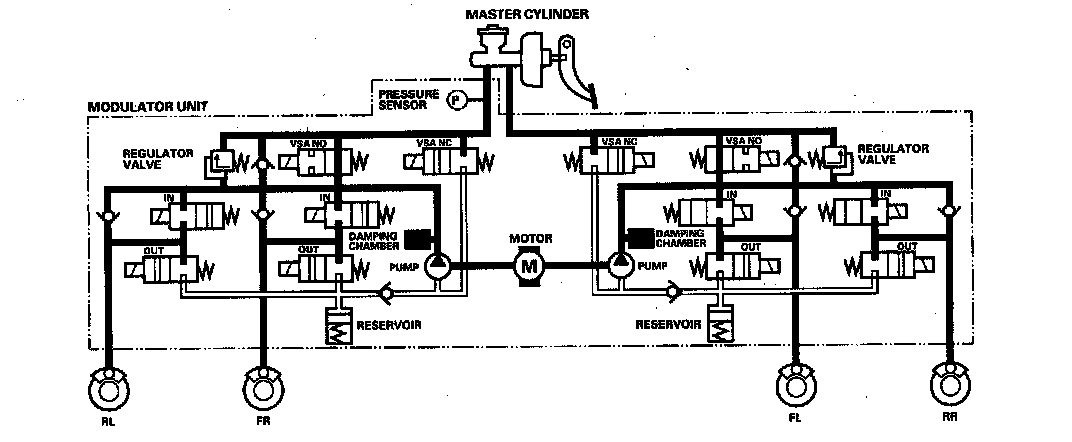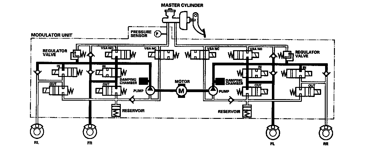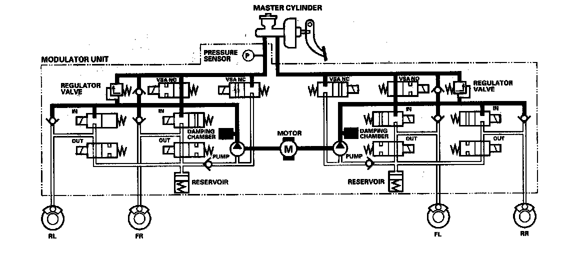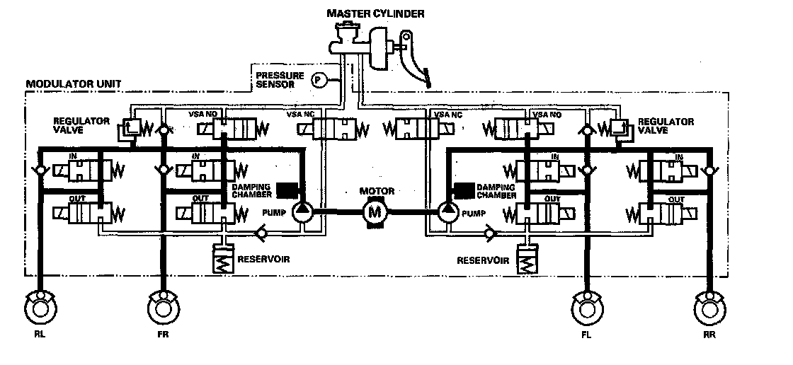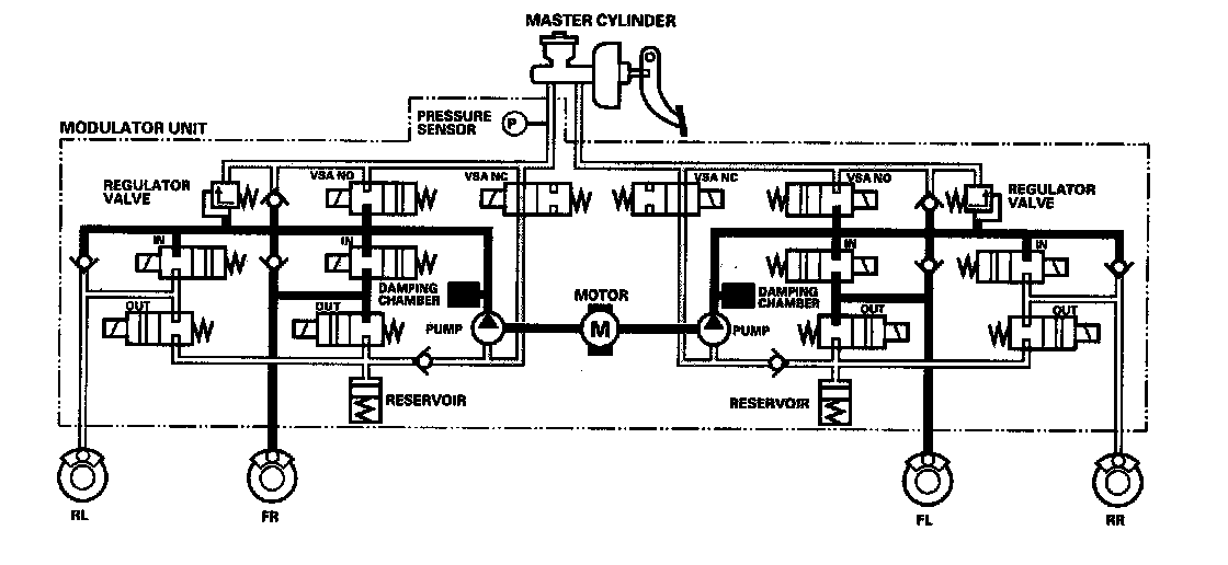The modulator unit consists of the inlet solenoid valve, outlet solenoid valve, VSA normally open (NO) solenoid valve, VSA normally closed (NC) solenoid valve, reservoir, pump, pump motor, and the damping chamber.
