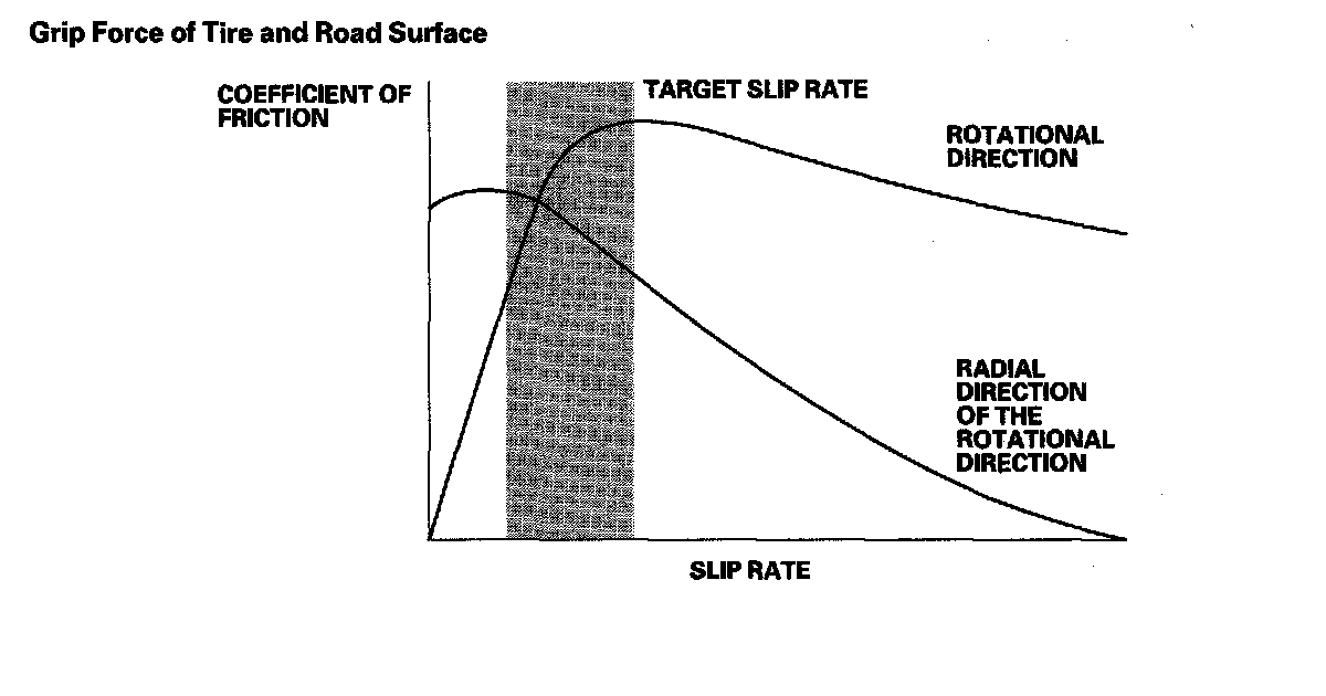 The ABS precisely controls the slip rate of the wheels to ensure maximum grip force from the tires, and it thereby ensures maneuverability and stability of the vehicle. The ABS calculates the slip rate of the wheels based on the vehicle speed and the wheel speed, then it controls the brake fluid pressure to reach the target slip rate.