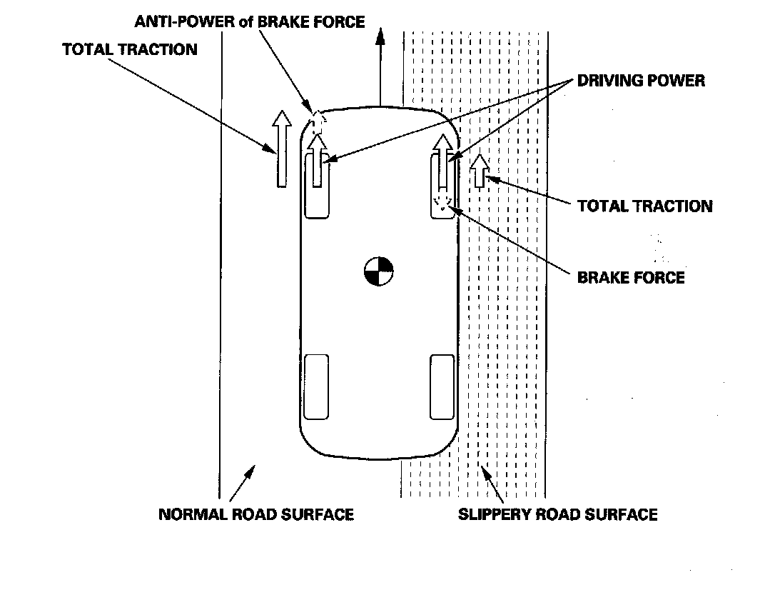 When a drive wheel loses traction on a slippery road surface and starts to spin, the VSA modulator-control unit applies brake pressure to the spinning wheel and sends an engine torque control request to the ECM/PCM to slow the spinning wheel and keep traction.