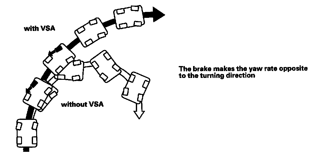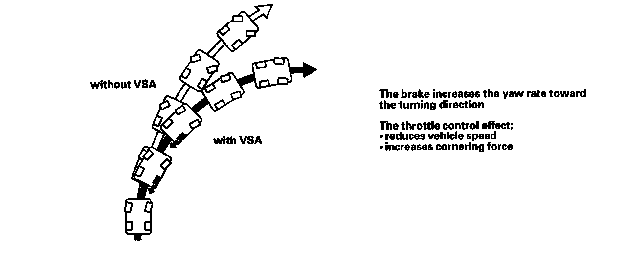 Under hard braking conditions, the VSA modulator-control unit monitors wheel speed in order to allow a maximum amount of brake distribution individually to the rear wheels. Once the VSA modulator-control unit detects that one or both rear wheels are nearing their maximum braking potential, the inlet valve closes for one or both rear wheels, maintaining the current pressure. If the traction is improved, and the wheel(s) is no longer nearing its limits, the VSA modulator-control unit will open the inlet solenoid allowing additional pressure to be distributed to the rear wheel. The rear wheels are controlled independently of each other during EBD function.