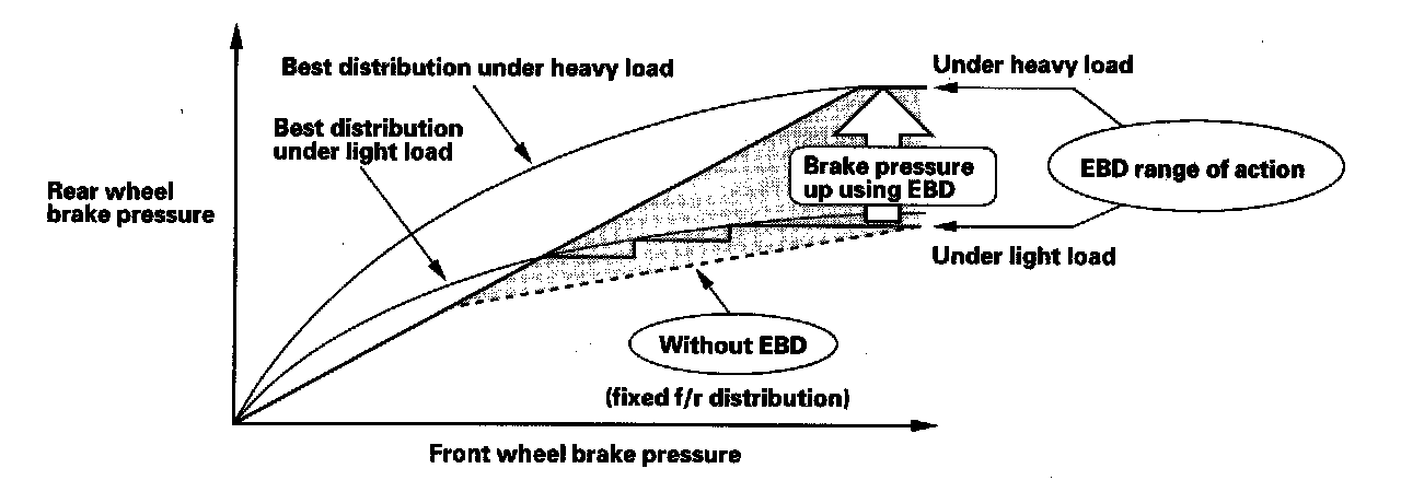 When the vehicle is heavily loaded, most of the increase in weight is born by the rear wheels, increasing braking capability. Proportioning valves maintain a fixed distribution of brake pressure between the front and the rear wheels, making it very difficult to fully utilize increased rear wheel braking capability. EBD varies brake pressure distribution according to load, using input from the wheel speed sensors, which improves overall braking performance.