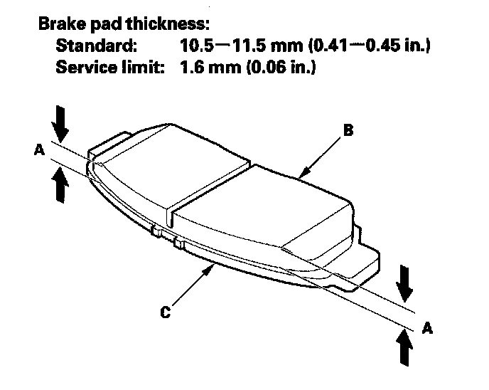 4. Check the thickness (A) of the brake pads (B). Do not include the thickness of the brake pad backing plate (C).