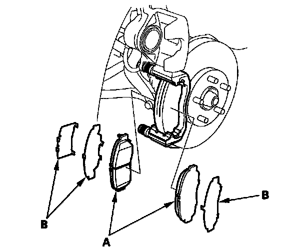 14. Install the brake pads and pad shims correctly. Install the pad with the wear indicator (C) on the upper inside. If you are reusing the brake pads, always reinstall the brake pads in their original positions to prevent a momentary loss of braking efficiency.