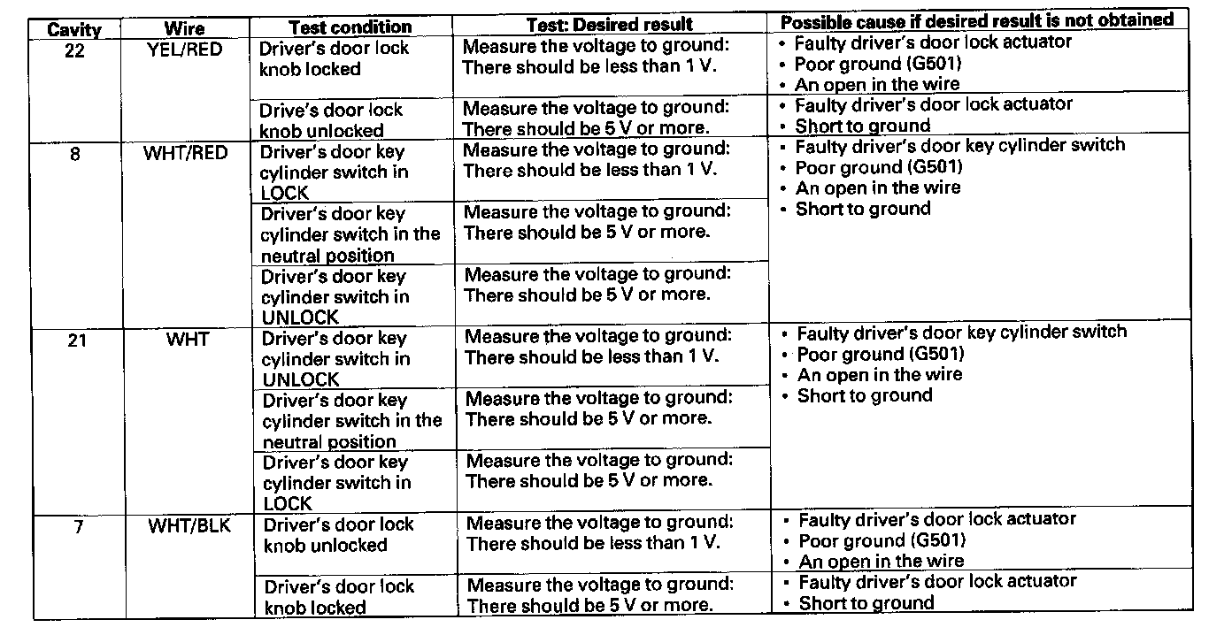 10. Reconnect the connector to the door multiplex control unit, turn the ignition switch ON (II), and make these input tests at the connector.