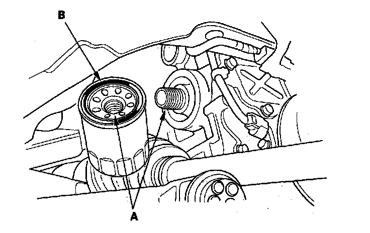2. Inspect the threads (A) and the rubber seal (B) on the new filter. Clean the seat on the engine block, then apply a light coat of oil to the new filter rubber seal. Use only filters with a built-in bypass system.