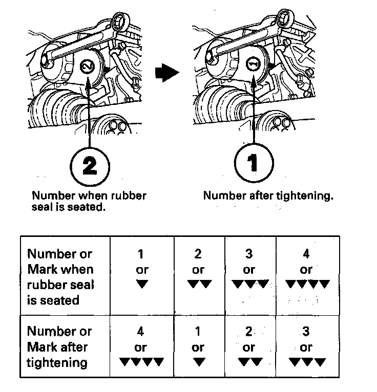 ^ Spin the filter on until its seal lightly seats against the block, and note which number or mark is at the bottom.