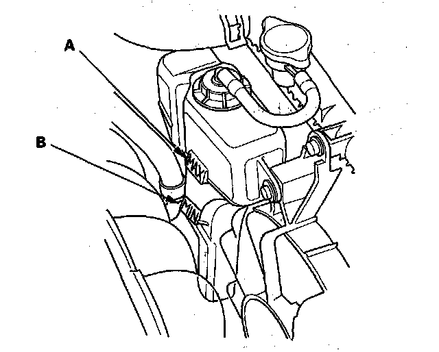 1. Look at the coolant level in the coolant reservoir. Make sure it is between the MAX mark (A) and MIN mark (B).