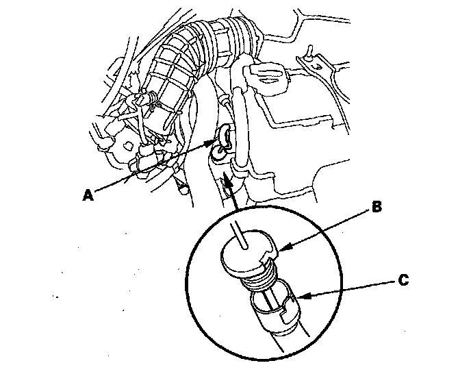 5. Insert the dipstick (A) into the dipstick guide pipe while aligning the cap (B) with the guide tab (C).