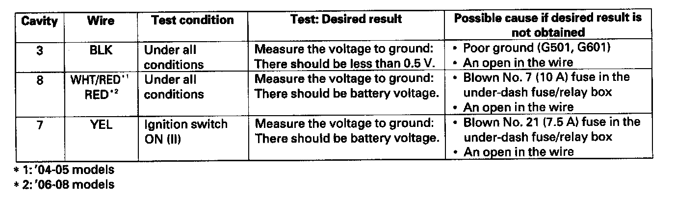 4. Reconnect the connector to the wiper/washer switch, turn the ignition switch ON (II), and make these input tests at the connector.