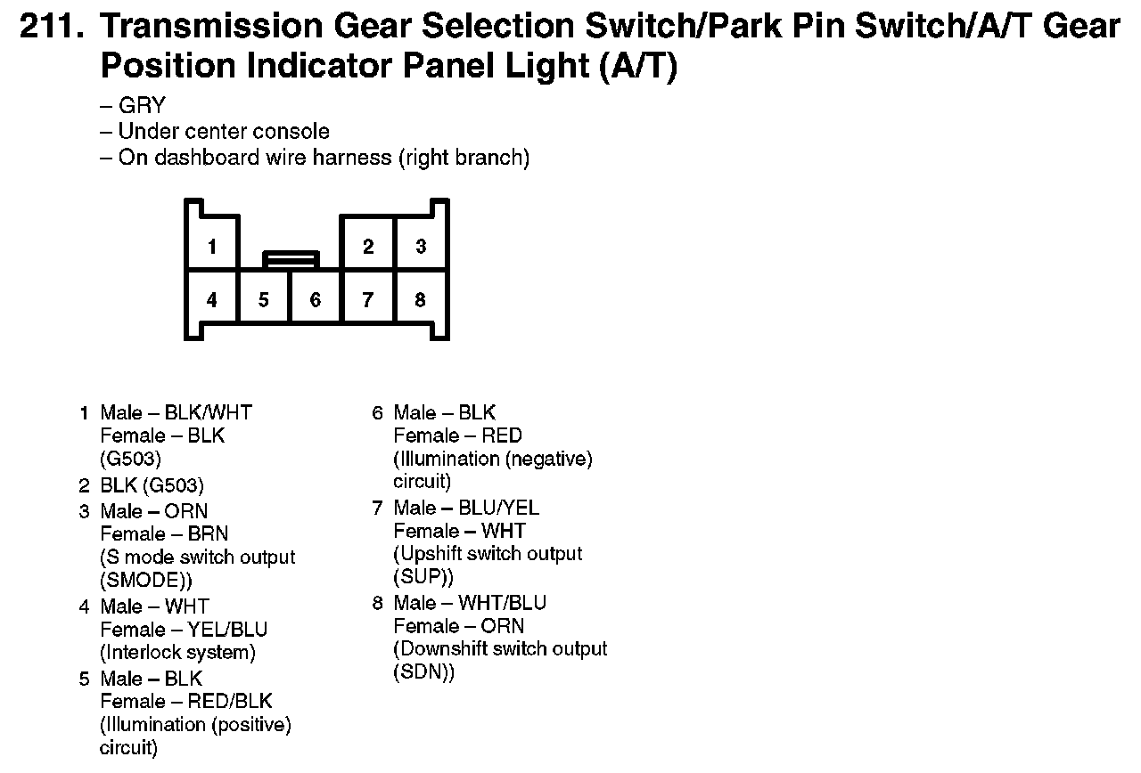 211. Transmission Gear Selection Switch/Park Pin Switch/A/T Gear Position Indicator Panel Light (A/T):