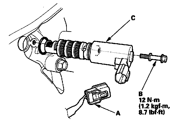 2. Remove the bolt (B) and the VTC oil control solenoid valve (C).